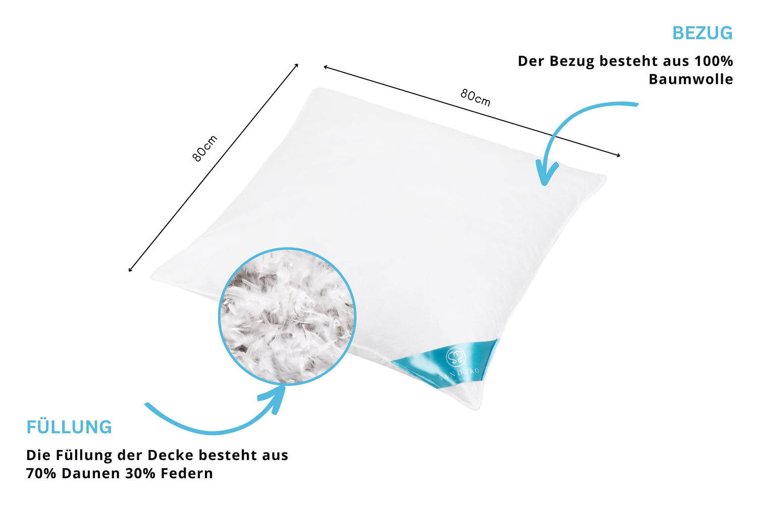 Gefüllt mit feinsten europäischen Daunen und Federn, um höchste Weichheit und Langlebigkeit zu garantieren. Atmungsaktiv, temperaturregulierend und hypoallergen – für jede Jahreszeit perfekt.